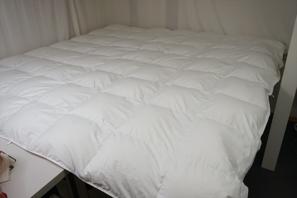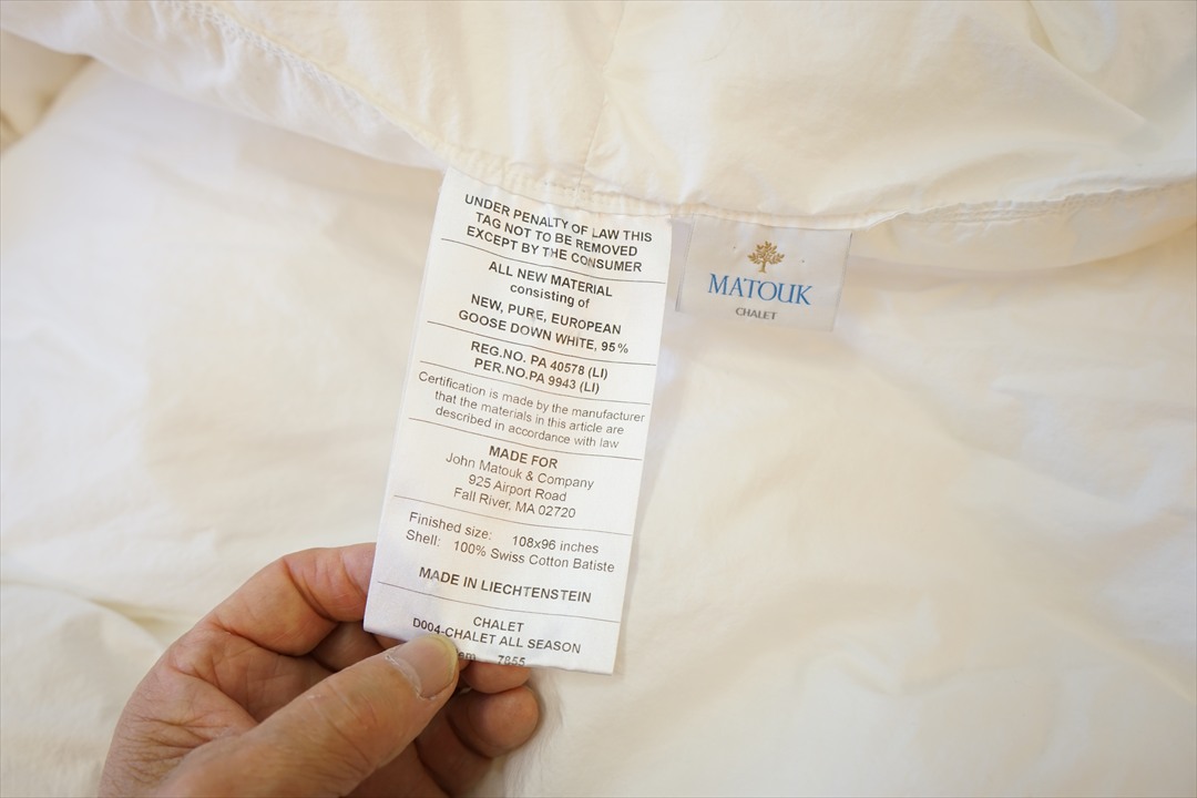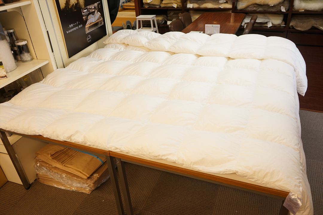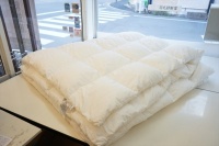 | 羽毛布団の仕様は既存のお布団と同じくらいのボリューム(厚さ)で、サイズは当初のご希望通りオーダーサイズ231x231cmで仕上げる事になりました。 新しい231x231cmの側生地には、スーパーソフトサテン生地を選ばれて、キルト縫製は8x7マスにしてマチ高さは5cmで縫製で仕立てました。 羽毛は傷みも少なく状態も良かったので、お布団を解体をして取り出した羽毛量は1,030gで、これを洗浄・除塵加工して再生された羽毛量880gでした。 お預かりした羽毛布団は275x245cmと大きく羽毛量は1,070g入り仕様でした。 次は231x231cmと既存より少し一回り小さくなるので、仕上がった羽毛量880gだけを充填して、新しい羽毛の補充は無しで仕上げる事になりました。 仕上がった羽毛布団は、側生地も上質な柔らかいサテン地を選ばれて風合いも同じで、マチの高さも羽毛量も同等になりましたので、ご希望通りの羽毛布団になったと思います。 |