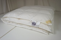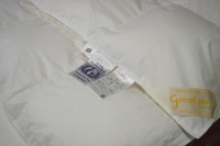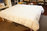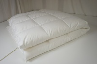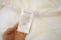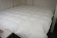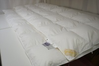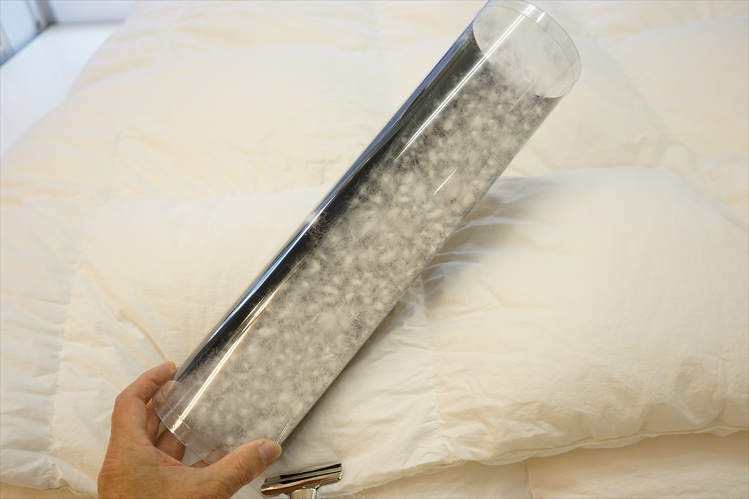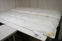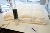 | 届いた羽毛布団は、とても大きく200x200cm角のテーブルの上に置いてもこのように大きな羽毛布団でした。 羽毛布団の品質表示には、羽毛はヨーロピアンホワイトグースダウン95%を使用して羽毛量は38オンス(1077g)入りでした。 サイズは108x96 inches(275x245cm)で、側生地にはスイスコットン綿100%の平織が使用と記入されていました。 側生地のキルト縫製は、9x8マス・マチ高さ約5cmで、生地はとても軽量でソフトです。 側生地の傷みも無く羽毛の吹き出しも見られませんでした。 次に、中綿の診断をしました。 羽毛布団の中当たりのサイドから1gの羽毛を取り出して羽毛の傷み具合を診断しました。 取り出した羽毛は、ダウンボールもしっかりして羽毛のヘタリや毛玉とファイバーも少なく、少しピリング羽毛は見られますが、未だこのような状態でしたらリフォームは充分に可能だと診断出来ました。 この結果をお客様へご報告をしリフォーム相談をすすめました。 |