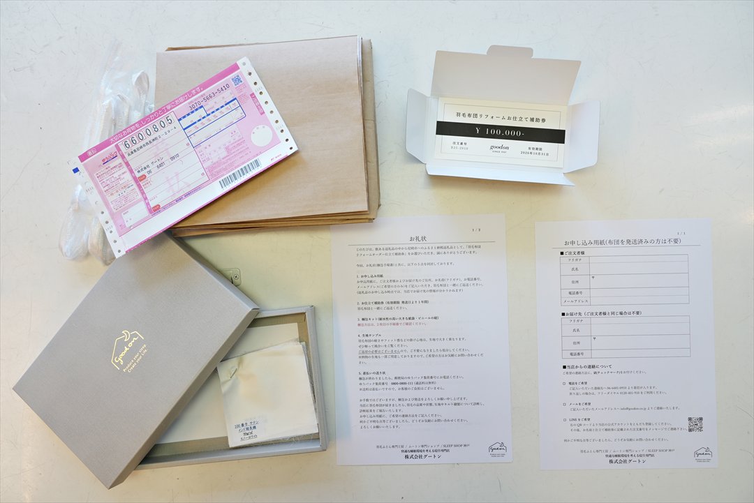 返礼品には、「仕立て補助券やお申込書」「発送用の梱包キット」「生地サンプル」などをお入れしています。