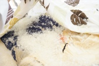 羽毛吹き出している状態では到底家庭では処理が出来ませんので、羽毛布団は掛けカバーを掛けたままで送っていただきました。 そっと掛けカバーを外して羽毛布団の診断をしましたが、品質表示ラベルは見えない状態でした。 メーカーさんはフランスベッド製で側生地にはシルクの混紡が使われていて、生地が裂けて羽毛が出来ている状態でした。 羽毛は、ダウンボールは大きく傷み度は中度程度でしたのでリフォームは可能と診断できました。 この結果をお客様へご報告をして、リフォームのご希望内容をお聞きしました。 |