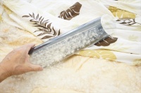 神奈川県横浜市にお住いのI様より「シングルサイズの羽毛布団が掛けカバーの中で羽毛が一杯になっていて困っていてリフォームしたいのですが…」とご相談をいただきました。 ご使用も10年以上ということでしたので、羽毛布団の診断から始めさせていただくことになり生地サンプルを同封して「梱包キット」をお届けしました。 |
