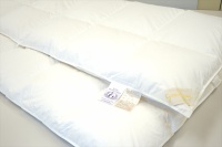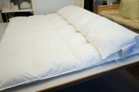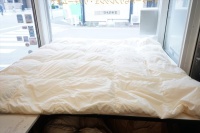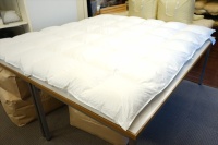| 次も同じダブルサイズの羽毛布団にリフォームされる事を希望されておられましたので、新しい側生地と補充する羽毛、そしてキルト縫製の説明をさせていただきました。 ダウナ羽毛布団のリフォーム時に気を付けている事は、ダウナの羽毛布団はとても軽量で柔らかい綿100%の生地が使われており、他の生地の側生地を選ばれた場合には、ダウナ羽毛布団本来の風合いが変わってしまいますので特に気を付けております。 選ばれた生地は「スーパーライトバチスト地 綿100%」です。 ダウナのキルト縫製は5x5マス・マチ高さ10cmととてもマス目も大きく、マチ高さも高く、ボリュームのある縫製スタイルになっていますが、キルト縫製は6x6マス・マチ高さ8cmで仕上げる事になりました。 そして、ダウナ羽毛布団の羽毛の充填量は少なくて、より軽量の羽毛布団の仕上がりになっています。 それは高品質の羽毛が使われている為であり、同じ様に仕上げるには同等クラスのマザーグース羽毛で補充することをお薦めしております。 選ばれた足し羽毛は、同じポーランド産マザーグースダウン95%で補充することになりました。 洗浄加工後に再生された羽毛は950gとなりましたので、ポーランド産マザーグースダウン95%を350g足して羽毛量1,300g入りで仕上げることになりました。 |