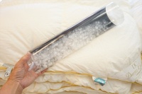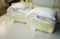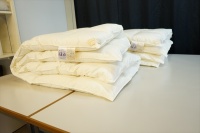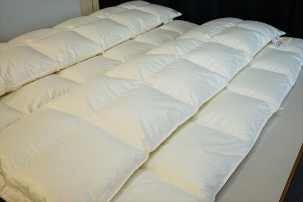 | リフォームが可能と言うことで、先ずは洗浄・除塵加工をして羽毛量が確定をしてから再度どの様に仕上げるかの相談をすることになりました。 羽毛布団を解体をして取り出した羽毛量は2枚で2.35Kgで、洗浄加工後に仕上がった羽毛量は2枚で1.92Kgとなりました。 お客様と相談の結果、リフォーム仕立てはセミダブルサイズで本掛けと合い掛けの2枚に仕上げる事になり、羽毛量は本掛けには1.25Kg入り、合い掛けには0.7Kg入りで仕上げる事になり、足らない羽毛分は最高品質のポーランド産「ファイネス」マザーグースダウン95%を30g足すことにしました。 新しいセミダブルの側生地には、スーパーライトバチスト生地を使用し、キルト縫製を本掛け用は5x6マス・マチ高さ8cm、合い掛け用は6x7マス・マチ高さ4cmにしました。 |