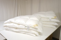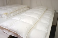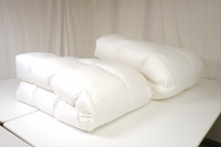 | リフォームをして仕上げる羽毛布団は中高生の若い方が使われるので、通常の冬用タイプくらいのシングル2枚に仕上げることになりました。 元の羽毛量は1.7Kgで洗浄後に再生された羽毛量が1.48Kgとなりましたので、これを二等分して足らない分をポーランド産マザーグースダウン93%をそれぞれ260g足して1.0Kg入りにして、新しい生地にはスーパーソフトサテン生地を選ばれて、キルト縫製は5x6マスの7cmマチ高さにして仕上がることになりました。 |
