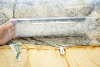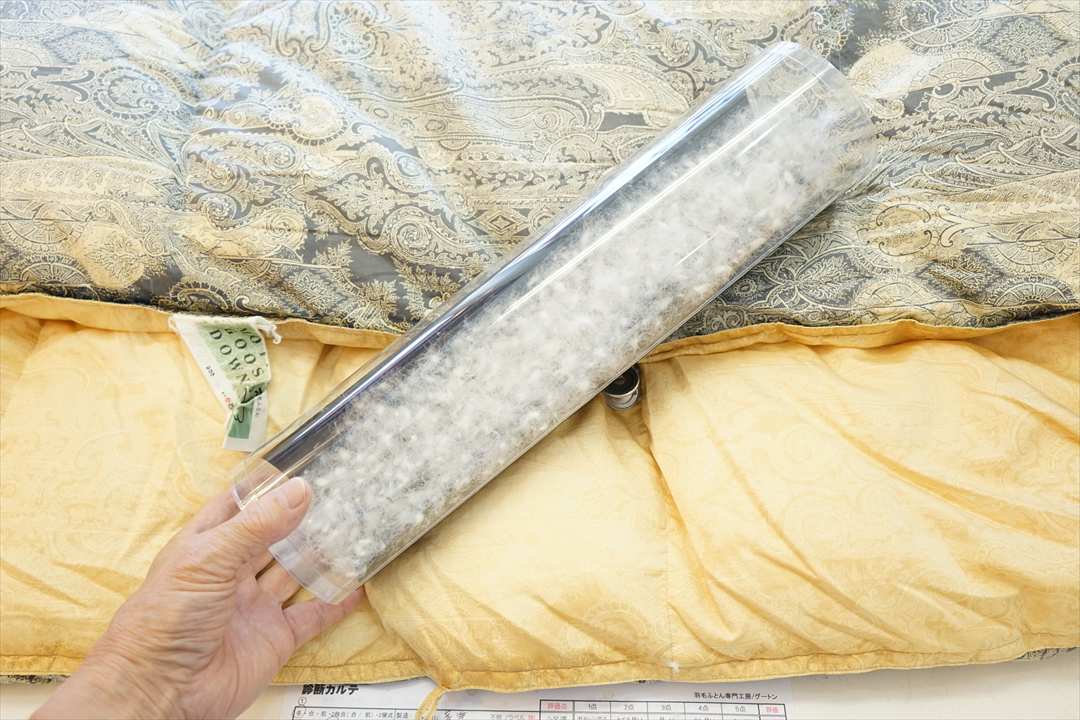 | 届いた羽毛布団は西川産業さんのダブルサイズの羽毛布団です。 お布団はふっくらとしていて四つ折りにした時の高さも40cmあり、綿100%素材のとても軽くて柔らかい上質な生地が使われており、羽毛もハイクオリティーのマザーグースダウン95%が1.7Kg入っている羽毛布団で、外観からの診断はリフォームが出来そうな状態でした。 次は、中綿の羽毛の診断です。 羽毛布団より1gの羽毛を取り出して羽毛の傷み度と羽毛クラスをチェックしました。 品質表示ラベルの通り羽毛のダウンボールは大きくマザーグースダウンと判断できました。 羽毛の傷み度は、羽毛のヘタリが見られ毛玉やピリングとファイバー共にあり「Cランク」と診断しリフォームは可能としました。 以上をお客様へご報告をして再度リフォームの相談をさせていただいて、とりあえずリフォーム洗浄加工を施して再生羽毛が仕上がってから、再度新しい側生地と羽毛の充填量や足し羽毛の種類と補充量を決めることになりました。 |