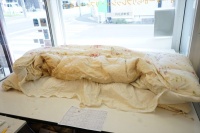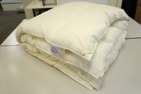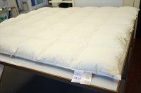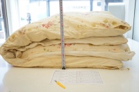 | 届いた羽毛ふとんは写真の様に掛けカバーの中は羽毛が溢れておりました。 原因は側生地が破れていて、その部分を補修をしてありましたが羽毛で一杯でした。 品質表示ラベルには側生地は綿100%使用、キルト縫製は5x6マス、羽毛はダウン率95%で羽毛量は1.7㎏入りとありました。 次は、中綿の羽毛を1g取り出して羽毛の傷み度を診断しました。 羽毛には目立った傷みは見られませんでしたので、羽毛の傷み度はCランクと判断してリフォームは可能と診断しました。 |