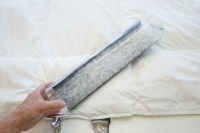 | 埼玉県新座市にお住いのM様から「22~3年使っているクィーンサイズの2枚合わせをシングルサイズの薄い目の羽毛布団にリフォームをしてほしい!」とリフォームのご依頼をいただきました。 サイズ変更リフォームのリフォーム料金をご紹介をしてご了承されましたので、新しい側生地の生地サンプルとリフォーム料金の詳細などを「梱包キット」に同封をして羽毛布団を送っていただきました。 |