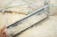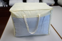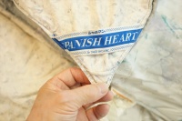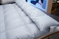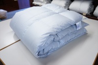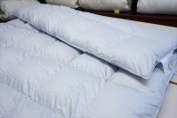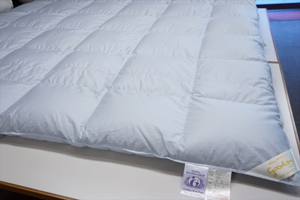 | お客様は同じダブルサイズの羽毛布団をご希望です。 とりあえず、羽毛の洗浄加工に掛からせていただいて、再生された羽毛の状態と羽毛量とで補充羽毛量を決めることになり洗浄加工を先に進めることになりました。 羽毛布団を解体をして取り出した羽毛量は1.59Kgで、プレミアムダウンウォッシュ洗浄加工して再生された羽毛量は1.27Kgとなりました。 この結果をお客さまへ連絡をして、ホワイトグースダウン90%を330g足して1.6Kg入りで仕上げることになりました。 また、側生地には60番手サテン地を使用して、キルト縫製は6x6マスにして、元の羽毛布団が2層式でしたので、冬用のレギュラータイプより少しマチの高さをアップして、マチ高さ8cmで仕上げることになりました。 |