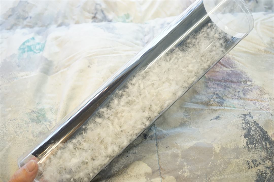 | 送っていただいた羽毛布団は、シャルマン製(武井商事)のダブル羽毛布団で、キルト縫製はツインキルトの2層式(4x4・5x5)、中綿の羽毛はハンガリー産ホワイトグースダウン95%で1.6㎏入りの羽毛布団でした。 生地からの羽毛の吹き出しは見られず、お布団を4つ折りにした高さは35cm程度の状態でした。 お布団より羽毛を1g取り出して羽毛の傷みをチェックしました。 毛切れしたファイバーと毛玉なども見られましたが、お布団にボリュームが少なかったのは、この写真の様に羽毛が寄れて羽毛の形状が閉じた状態のものがとても多くある為に嵩が出なかったからでした。 これは、お布団を2層式キルト縫製で仕立ててあり真ん中の仕切りにポリエステル生地が使われているので、静電気が生じて羽毛がこの様な状態になったものかもしれません。 でもこの状態でしたら羽毛を直接温水で洗浄加工を施して乾燥させればまた羽毛が開き再生されますのでリフォームは可能と診断しお客様へご報告をしました。 |