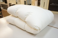 この様に羽毛量が各1.15Kgs入りと同じ目方でも、羽毛品質のダウンパワーが違うと軽くて保温性能も高くなりカサ高のある羽毛布団に仕上がります。