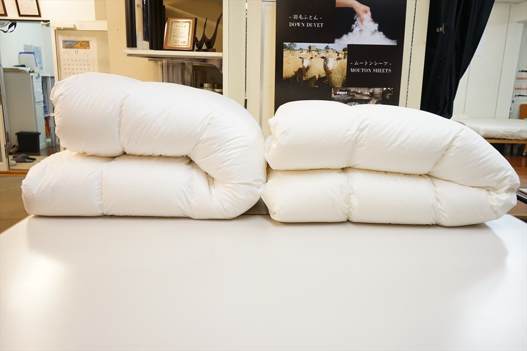 上の写真は、ご購入いただいた羽毛布団ですが、左側は最高品質マザーグースダウンの少し厚い目羽毛布団で羽毛量が1.15Kgs入り、右側は上質ホワイトグースダウンの冬用レギュラータイプ羽毛布団で羽毛量が左と同じ1.15Kgs入りの羽毛布団です。