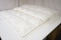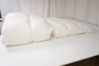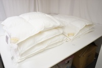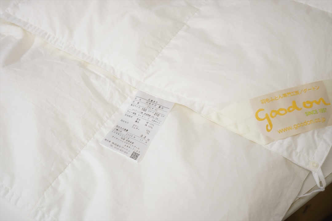 K様はオールシーズン使える2枚合わせタイプを希望されて、羽毛は上質のライオンヘッドグースダウンで、側生地には軽量で綿100%の80番手平織バチスト地をお選びになられて、シングルサイズでお作りをしました。