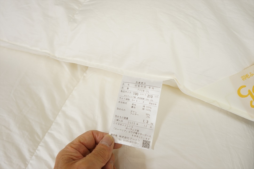 逸品のマザーグース羽毛布団をご購入された方よりお電話をいただき、今度はご両親様用に同じ「逸品」マザーグース羽毛布団冬用レギュラータイプでダブルサイズのご注文をいただきました。