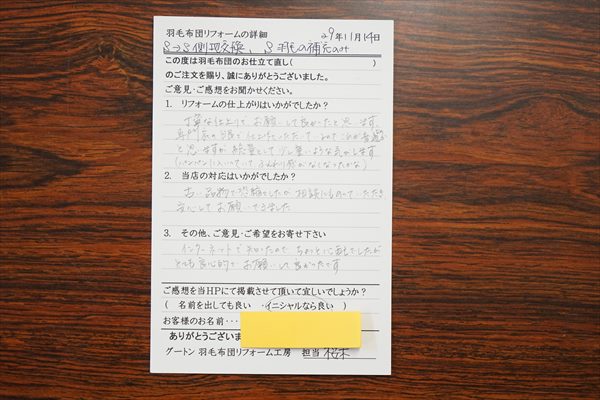 当店の羽毛布団をお買い上げいただいた方や、リフォーム(打ち直し)をご依頼いただいた方のお客様の声をご紹介いたします。