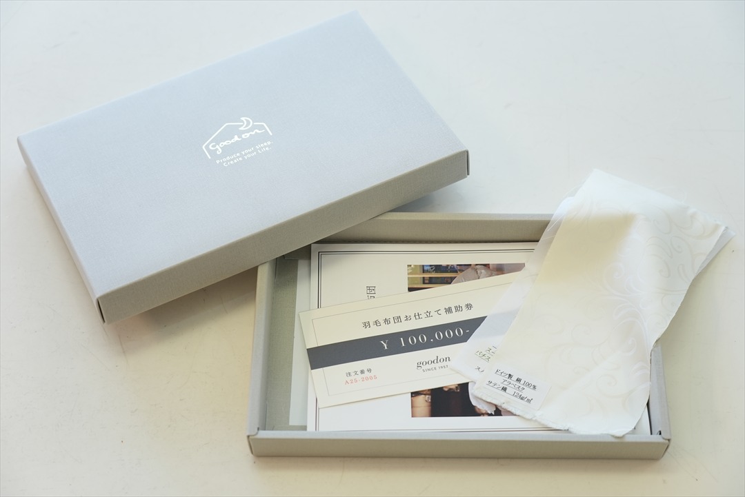 返礼品には、「仕立て補助券やお申込書」「発送用の梱包キット」「生地サンプル」などをお入れしています。