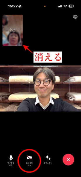 もしご自身のお顔が表示されるのがNGな場合は、ビデオ通話が繋がった後に