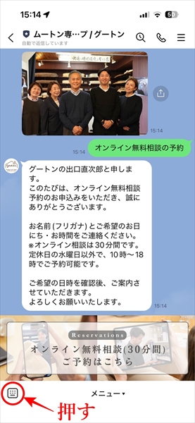 LINEのトーク画面を開くと、「オンライン無料相談の予約」というアイコンがあります。