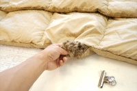 | おふとんは東京西川製のシングルサイズで、生地は絹と綿が混ざった上質なお生地が使われておりました。 羽毛はアイダーダックダウンが1.2kg入っており、少量の羽毛を取り出して状態を診断したところ、ファイバーと呼ばれる壊れて切れてしまっている羽毛が少し見られ、また絡み具合も少し弱まっていますが、十分に再生できる状態でした。 |