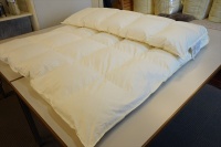 | シングルの重たい羽毛布団を軽い羽毛布団にリフォーム ・羽毛布団の解体費:シングル ¥2970、 ・羽毛洗浄費:1.5kgまで ¥9900、 ・新調の側生地:60番手サテン織 ¥13860、 ・羽毛の充填加工費:シングル ¥2970、 ・足し羽毛:無し ■合計金額は、¥29,700.-(税込み)となりました。 |