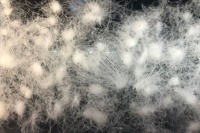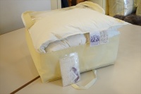| おふとんは月の友製でシングルサイズの冬用です。 生地は表も裏も絹(シルク)100%と品質表示ラベルに書かれており、また表には刺しゅうが施されております。 また、中地としてポリエステル地が縫い付けられておりました。 シルクは長年お使いいただくと、裂けてしまうデリケートな生地ですので、万が一裂けた場合も羽毛が吹き出さない様に考慮されたポリエステル地と思われますが、より重たくなるのと通気性が悪くなるので蒸れやすい環境を作る要因になっていたかと思われます。 羽毛は、ホワイトグースでダウン率95%の羽毛が1.5kg入りと品質表示ラベルに書かれています。 少量の羽毛を取り出して診断したところ、ファイバーと呼ばれる千切れてしまった状態の羽毛が見られますが、全体的に傷みは少なく、十分に再生できる状態です。 |