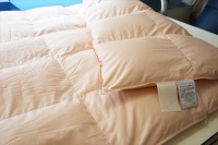 | 側生地は、60番手サテン織/K6600のピンクとブルー色で、足し羽毛の種類はホワイトグース90%でお決め頂き、少し薄い700g入りの春秋用羽毛布団を2枚に仕上げました。 |