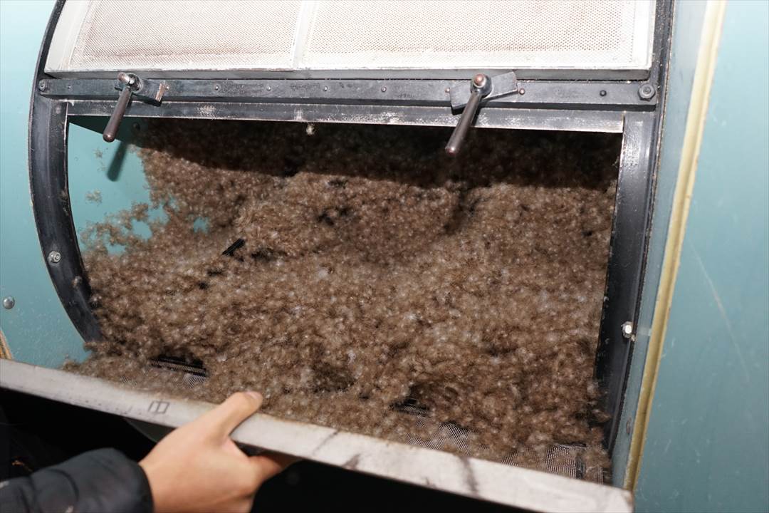 直接洗浄した後に解しながら乾燥する事で羽毛がフワッとした状態になり、1度目の除じん加工で取り除く事ができなかったダウン同士の間に残ったゴミを再度取り除いていきます。