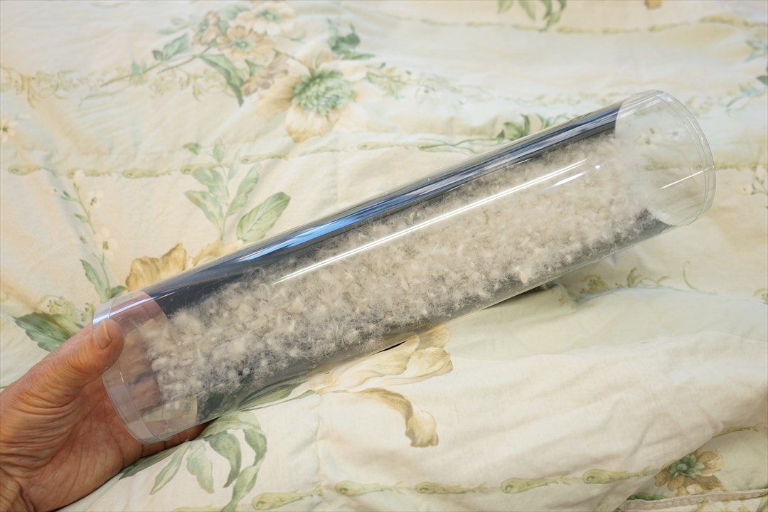 羽毛の診断で取り出した中の羽毛は、毛切れしたファイバーがとても多く見られ毛玉やピリングも目立った状態でしたので羽毛の傷み度はDランクです。