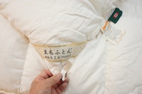 | お預かりした羽毛布団の生地がとてもソフトな生地でしたので、今限定で同等クラスのソフトサテン「ゴールド色」をお薦めしてお選びいただきました。 サイズは標準のシングル150x210cmで5x6マス仕様にて仕上げます。 羽毛量は、春秋用の少し薄い目がご希望でしたのでシングルで800g入りで仕上げることにして補充羽毛はポーランド産マザーグースダウン95%を選ばれて各30gづつ足して仕上げました。 |
