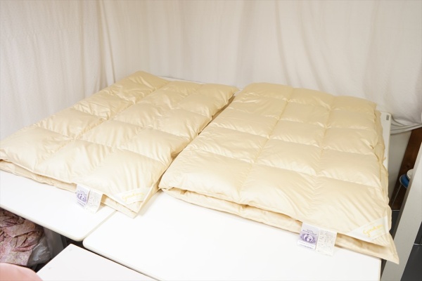 | 既存の羽毛布団には1.8kgの羽毛が入っていて、リフォーム洗浄加工後に再生された羽毛量は1.45kgに仕上りましたので、この仕上がった羽毛量を2等分の725g/枚にして、シングルサイズで春秋用の合い掛け羽毛布団2枚に仕上げる事になりました。 |
