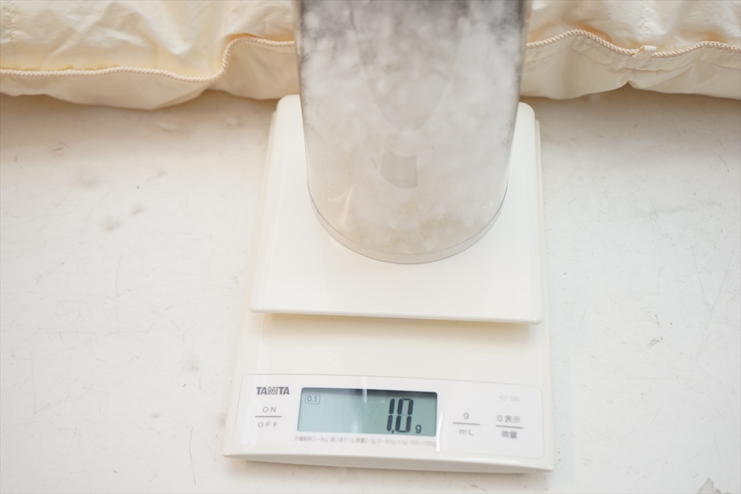 | なんと届いた羽毛布団はメイドインハンガリーと書かれていて、品質表示には水鳥羽毛100%、詰物2.1kg、側生地は綿100%との表示で、羽毛布団を四つ畳みにしたら53cmの膨らみがあり、側生地も汚れが無くキレイな状態でした。 羽毛布団のサイドから羽毛を1g取り出して診断をしました。 写真でお分かりの様に、羽毛のダウンボールも大きく、まだシッカリとしたダウン形状が見て取れました。 ファイバーも毛玉もとても少なくて羽毛の傷み度はBランクと診断をし、リフォームは当然オススメで可能としました。お客様へ診断の結果をご報告をしてリフォーム加工にかからせていただきました。 |