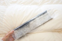 | 次も同じダブルサイズの羽毛布団にリフォームされる事を希望されておられましたので、新しい側生地と補充する羽毛、そしてキルト縫製の説明をさせていただきました。 ダウナ羽毛布団のリフォーム時に気を付けている事は、ダウナの羽毛布団はとても軽量で柔らかい綿100%の生地が使われており、他の生地の側生地を選ばれた場合には、ダウナ羽毛布団本来の風合いが変わってしまいますので特に気を付けております。 選ばれた生地は「スーパーライトバチスト地 綿100%」です。 ダウナのキルト縫製は5x5マス・マチ高さ10cmととてもマス目も大きく、マチ高さも高く、ボリュームのある縫製スタイルになっていますが、キルト縫製は6x6マス・マチ高さ8cmで仕上げる事になりました。 そして、ダウナ羽毛布団の羽毛の充填量は少なくて、より軽量の羽毛布団の仕上がりになっています。 それは高品質の羽毛が使われている為であり、同じ様に仕上げるには同等クラスのマザーグース羽毛で補充することをお薦めしております。 選ばれた足し羽毛は、同じポーランド産マザーグースダウン95%で補充することになりました。 洗浄加工後に再生された羽毛は950gとなりましたので、ポーランド産マザーグースダウン95%を350g足して羽毛量1,300g入りで仕上げることになりました。 |