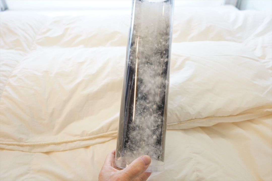 | 羽毛布団は大塚家具さんのダウナ羽毛布団ダブルサイズです。 この羽毛布団は通常のダブルサイズよりも少し小さい180x210cm仕上げの羽毛ふとんです。 また、マス数が5x5マスでマチの高さが約10cmあり、とても軽くて柔らかい生地が使用されているので、とても膨らみ保温性が高い羽毛布団です。 品質表示ラベルには、ポーランド産マザーグースダウン95%が1240g入っていると表示されています。 この羽毛布団から羽毛を1g取り出して羽毛の状態を確認しました。 ご覧のように、羽毛のダウンボールは大きくて毛玉もファイバーも少ない状態ですが、少しピーリングは見られました。しかし、この程度の傷みの状態でしたらリフォームは可能と診断されてお客様へ報告をして洗浄・除塵加工に掛からせていただきました。 |