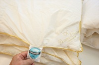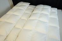| リフォームが可能と言うことで、先ずは洗浄・除塵加工をして羽毛量が確定をしてから再度どの様に仕上げるかの相談をすることになりました。 羽毛布団を解体をして取り出した羽毛量は2枚で2.35Kgで、洗浄加工後に仕上がった羽毛量は2枚で1.92Kgとなりました。 お客様と相談の結果、リフォーム仕立てはセミダブルサイズで本掛けと合い掛けの2枚に仕上げる事になり、羽毛量は本掛けには1.25Kg入り、合い掛けには0.7Kg入りで仕上げる事になり、足らない羽毛分は最高品質のポーランド産「ファイネス」マザーグースダウン95%を30g足すことにしました。 新しいセミダブルの側生地には、スーパーライトバチスト生地を使用し、キルト縫製を本掛け用は5x6マス・マチ高さ8cm、合い掛け用は6x7マス・マチ高さ4cmにしました。 |