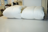 | 届いた羽毛布団は大塚家具さんのダウナシリーズの羽毛布団2枚です。 一枚はクィーンサイズ220x210cmで、ポーランド産マザーグースダウン95%が1.2Kg入りで側生地は超軽ソフトで綿100%の生地が使用されていて、キルト縫製は6x5マスのマチの高さ10cmありました。 生地からは少し羽毛の吹き出しが見られました。四つ折りにした時の高さは35cm程度です。 もう一枚は品質表示の内容は薄くて読めませんでした。 キルト縫製は5x5マス、マチ高さ10cmで、これも生地から羽毛の吹き出しが見られました。 四つ折りにした時の高さは38cmありました。 このクィーンとダブルの羽毛布団をセミダブル合い掛けとシングル本掛けにリフォームにしたい!とメモも同封いただきました。 各羽毛布団より羽毛を取り出して「羽毛の診断」をしました。 両方ともダウンは大きくしっかりと密度も高く羽毛の種類はマザーグースと思われました。 羽毛の傷みはファイバーは少し見受けられましたが、全体的に傷みも少なく傷み度はBCランクと診断しまし、リフォームは充分可能な状態でした。 この診断結果をお客様へ報告をして再度リフォームについて相談をさせて頂きました。 |