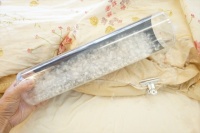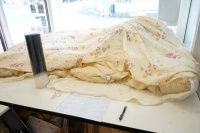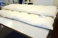 | 届いた羽毛ふとんは写真の様に掛けカバーの中は羽毛が溢れておりました。 原因は側生地が破れていて、その部分を補修をしてありましたが羽毛で一杯でした。 品質表示ラベルには側生地は綿100%使用、キルト縫製は5x6マス、羽毛はダウン率95%で羽毛量は1.7㎏入りとありました。 次は、中綿の羽毛を1g取り出して羽毛の傷み度を診断しました。 羽毛には目立った傷みは見られませんでしたので、羽毛の傷み度はCランクと判断してリフォームは可能と診断しました。 |