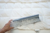 | 埼玉県新座市にお住いのM様から「22~3年使っているクィーンサイズの2枚合わせをシングルサイズの薄い目の羽毛布団にリフォームをしてほしい!」とリフォームのご依頼をいただきました。 サイズ変更リフォームのリフォーム料金をご紹介をしてご了承されましたので、新しい側生地の生地サンプルとリフォーム料金の詳細などを「梱包キット」に同封をして羽毛布団を送っていただきました。 |