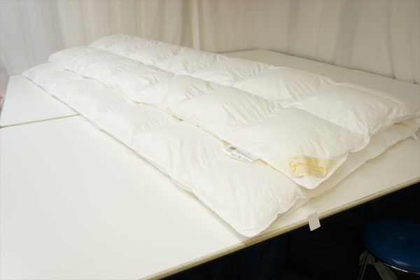 「薄め」を体験いただいたところこれでも厚すぎるとの事で、更にマチ高を低くした春秋用(合い掛け)を触っていただき、温度・湿度調整をしている寝室にはこの程度が良いとお決めいただきました。