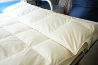 | 写真でわかるように側生地の破れが所々あり、羽毛の吹き出しが非常に多くありましたが、羽毛の状態は悪くなく、次のサイズは今より小さくなりますので、足し羽毛も必要ないと診断しました。 今の側生地は、60番手位と同等です。前もって側生地のサンプルを送らせて頂き、お電話でご説明した際に、手にとってご覧頂き、次の側生地も60番手/E6060にお決め頂きました。 |
