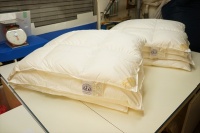 | 羽毛の種類は、シルバーグース(少しブラウンがかった羽毛)でした。 状態は、冬掛けは2枚共に大きな目立った傷みはなく、また肌掛けも冬掛けに比べたらファイバーが少し多いかなぁと思うくらいでした。側生地が表綿が絹混の為、綿100%に比べて弱いので破れがありましたが、羽毛は状態が良かったので、足し羽毛も多くにはならないと診断しました。 お客様より、足し羽毛も今より更に上質もご希望でしたので、ポーランドのマザーグース95%にお決め頂きました。結果、次の冬掛けの羽毛量は元の量(1.3kg)より少なく、1.27kgで充分です。 |