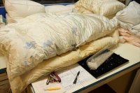 | 東京都、中野区より。ご使用年数は約18年ほど。羽毛が吹き出してきたので、今回冬掛けと肌掛けをご夫婦様分2組(計4枚)をすべてリフォームしたいとのご依頼のお電話を頂きました。 | |