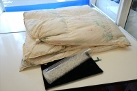 | ダブルの羽毛布団をカバンから取り出して、羽毛診断室にて羽毛布団を広げて、羽毛布団を4つ畳みにしたところ、羽毛布団の高さは約25cmで、中綿の羽毛も所々偏っている状態でした。 中綿の羽毛を取り出して診ますと、羽毛のファイバーとても多く見られ、毛玉も数多くあり、羽毛の傷み度「DEランク」でリフォーム不可と診断しました。 |