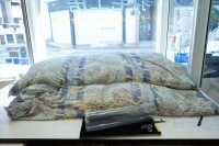 | 同じシングルサイズですが、一層式のエレガントキルト縫製で80番手の柄物にされました。羽毛量は元目方の1.2kgに戻します。 足し羽毛は今と同ランクのポーランド産ホワイトグース93%でお決め頂きました。 |
