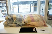 | 送って頂いた羽毛布団は、2枚とも同じマウンテンベース(サンモト社製造)ブランドの羽毛布団のペアー柄で、キルト縫製は4 x 5マスでマチ高が7cmと一般的な冬用の羽毛布団でした。 羽毛は、ホワイトグース95%と品質表示ラベルに書かれてあり、早速診断したところファイバー(羽毛の切れ端)は少し多く見られましたが、リフォームは可能な状態でしたのでお勧めいたしました。 |