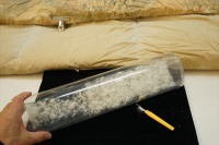 | 羽毛布団を上から触ってみると少し羽毛がダンゴになっている状態のモノが感じられました。羽毛ふとんを少し開けて中の羽毛を取り出すとやはり毛玉の状態が見られました。 他に、ファイバー化された羽毛も多く見られて羽毛の傷み度はDランクと診断です。 これではリフォームはオススメが出来ません。 |