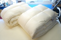 | ダブル羽毛布団をシングルサイズ2枚の羽毛布団にリフォーム ・羽毛布団の解体費:ダブル ¥3,500 ・羽毛洗浄費:1.8kg ¥13,000 ・新調の側生地:80番手超長綿/E8800/スノーホワイト色 @15600x2=¥31,200 ・羽毛の充填加工費:シングル@2700x2=¥5,400 ・足し羽毛:1,000g ホワイトグース90% @3300x10=¥33,000 ■合計金額は、¥86,100.-(税別)となりました。 |