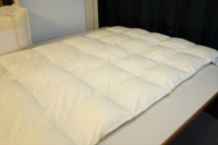 | クィーンサイズを変更して、シングルの合い掛けを2枚にリフォームします。 今の冬掛けは、クィーンで1.5kgほどの羽毛量ですので、シングルの合い掛けですと600~700g/枚位が適量だと思います。 まずは除塵・洗浄加工をして再生された羽毛量が確定した後、次の羽毛量・足し羽毛の種類はお決め頂くことに致しました。 洗浄加工後1,200gの羽毛が再生されましたので、今と同等クラスのポーランド産マザーグースダウンを200g補充して、700g入りの合い掛け羽毛布団に仕上がることになりました。 |